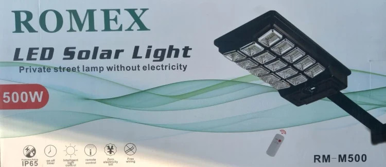 چراغ خورشیدی خیابانی 500 وات با کیفیت و نوردهی بسیار بالا قابل استفاده برای خیابان ها پارک ها باغ ها و ... است. محل نصب این چراغ روی میله یا دیوار می باشد. مدت زمان شارژ چراغ توسط نور خورشید حدود 5ساعت و مدت زمان نوردهی در شب حدود 12 ساعت می باشد . این چراغ دارای سنسور حرکتی بوده و همچنین دارای فتوسل میباشد که با تاریک و روشن شدن آسمان چراغ به صورت اتوماتیک روشن و خاموش می شود. برای این چراغ یک ریموت کنترل طراحی شده که دارای قابلیت روشن و خاموش شدن دستی و همچنین روشن ماندن تایمر دار و حالت اتومات و کم و زیاد کردن نور چراغ است . جنس بدنه از مواد مقاوم در برابر سرما و گرما و گرد و غبار و برف باران و اشعه خورشید می باشد.